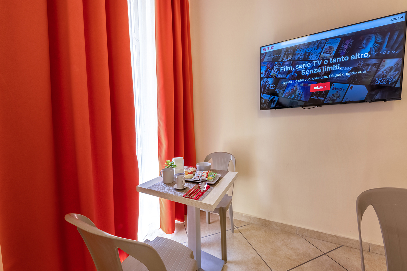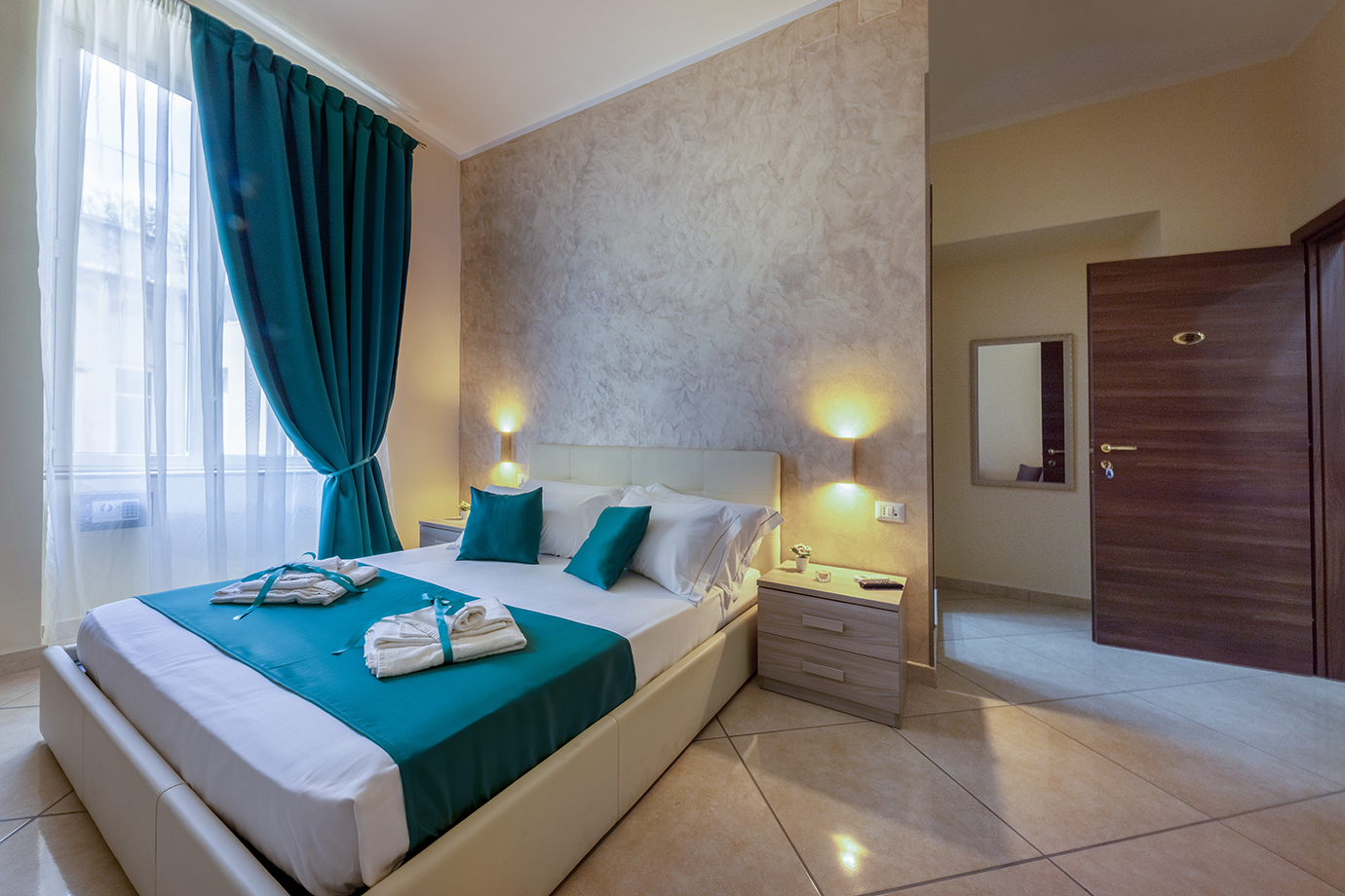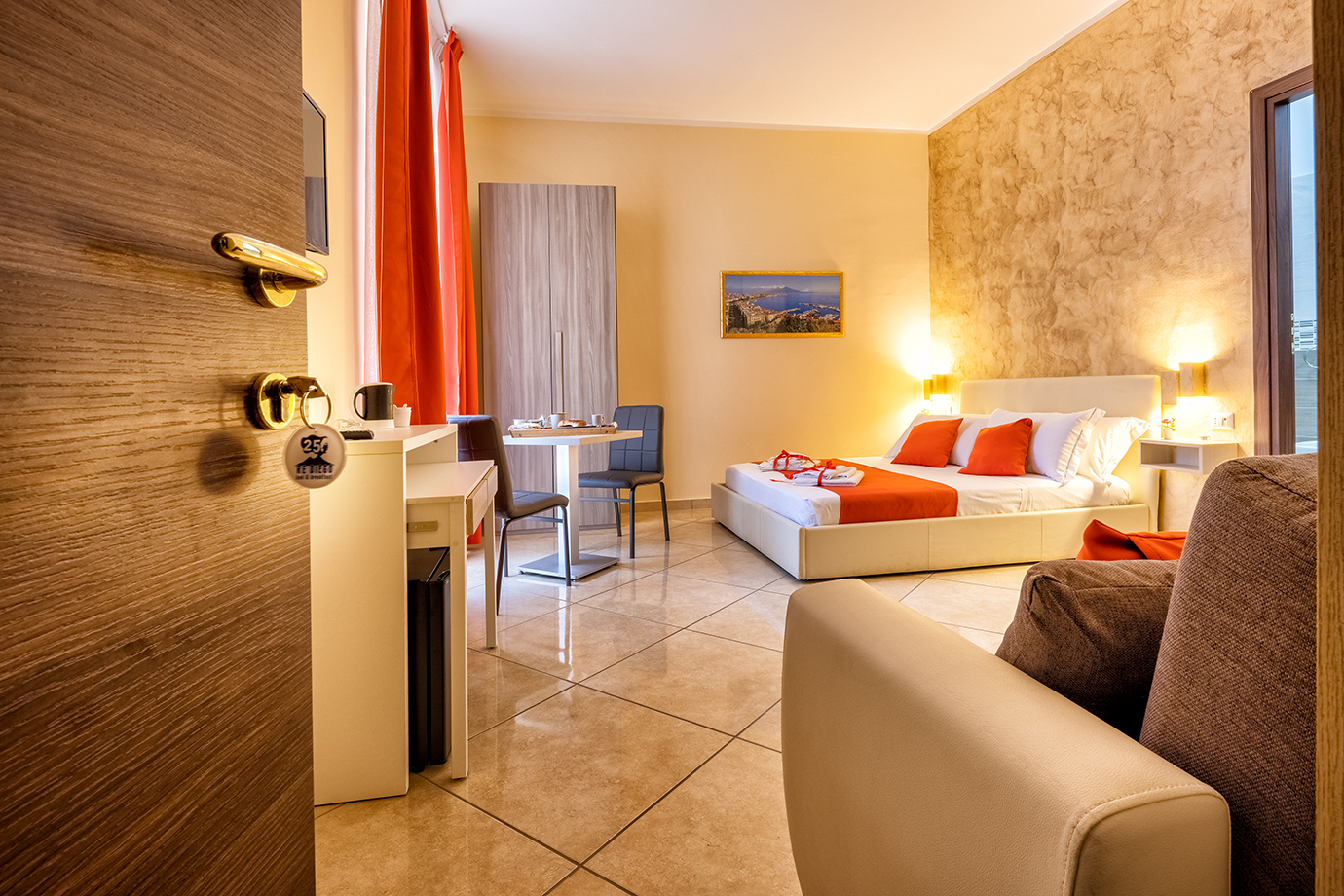 Le nostre camere sono pensate per chi vuole abbinare la bellezza di un alloggio moderno, senza rinunciare ad un ambiente accogliente e familiare. Le camere sono generose in termini di spazio e sono arredate con eleganza e stile. Tutte le camere sono dotate di materassi antibatterici, cassetta di sicurezza, Tv 32″ ad alta definizione, Minibar, Wi-Fi gratuito ad alta velocità, finestre e porte insonorizzate, aria condizionata e bagno privato. Tutte regalano una magnifica vista su Napoli e sulla nuova Stazione Centrale di Piazza Garibaldi, dove si può ammirare il gigante buono “Il vesuvio”.